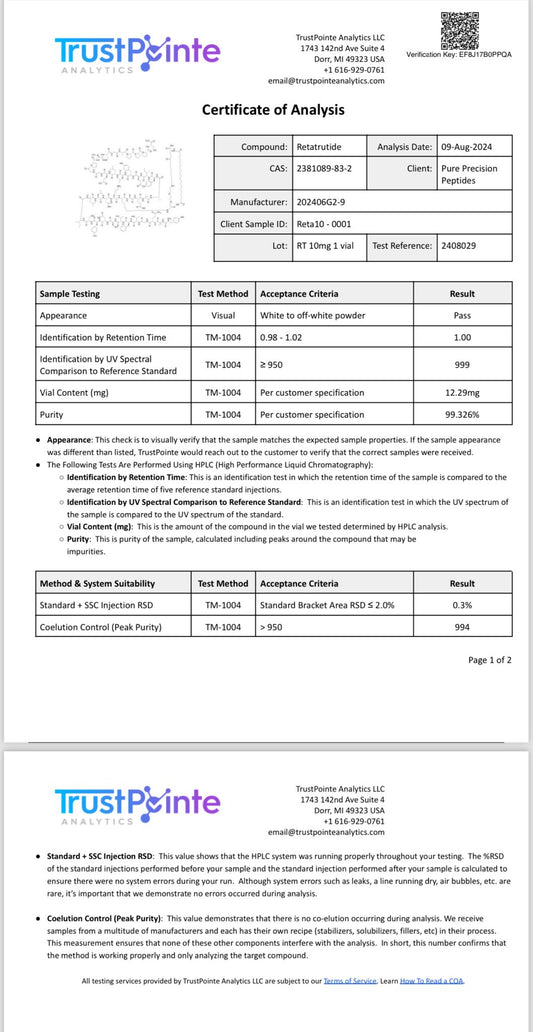 PURE PRECISION PEPTIDES has a commitment supply a strict to the use of our products solely for the purposes of LABORATORY RESEARCH. These substances must be handled exclusively by duly qualified and licensed professionals. They are strictly prohibited from any utilization as food suplements, pharmaceuticals, medicine,agricultural or pesticidal agents, food additives, or household chemicals. Any deviation from this intended use, or any misrepresentation, is in direct violation of established regulations.